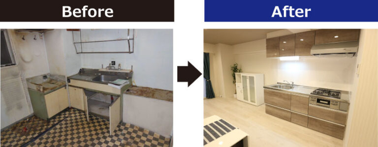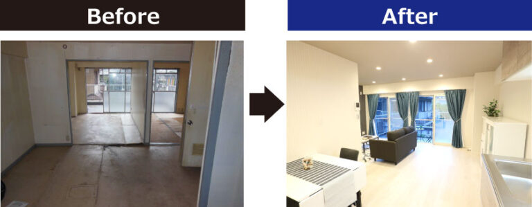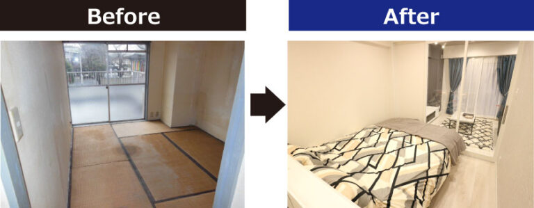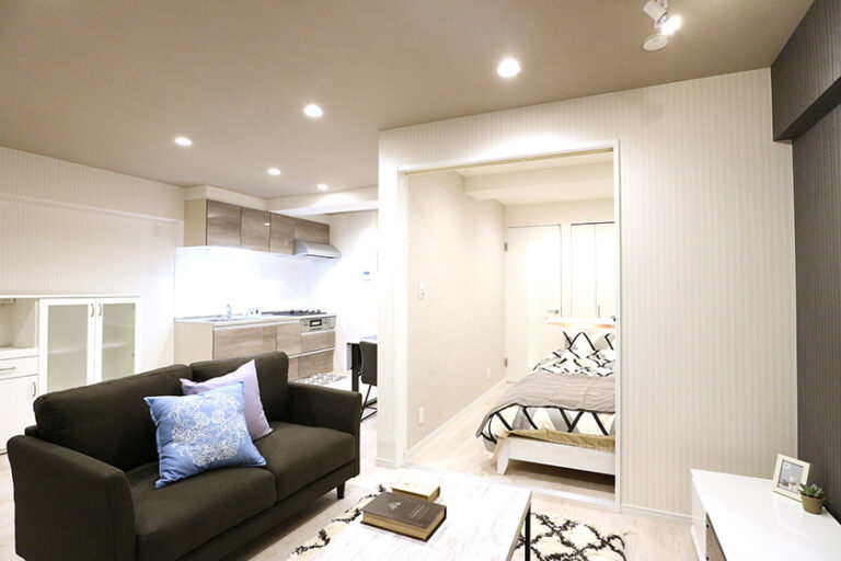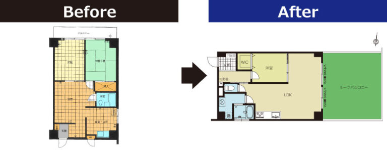 細かく区切られた2DKの間取り。お風呂、トイレ、洗面の3点ユニットの水回りで不便を感じるお部屋でしたが、明るく開放感のある1LDKのお部屋に変わりました。急行停車駅「田無」駅から徒歩5分の好ポジション。大型ルーフバルコニーが魅力の明るく開放的な1LDK住戸。立地の良さを活かして、投資用物件としてもご利用いただけます。