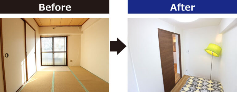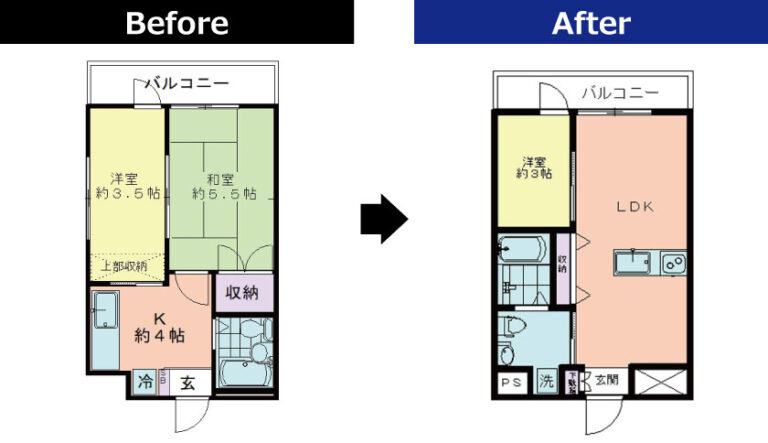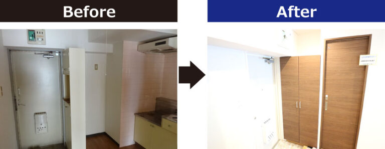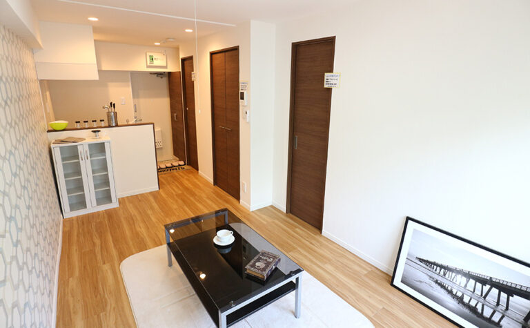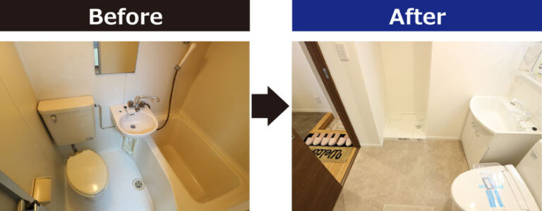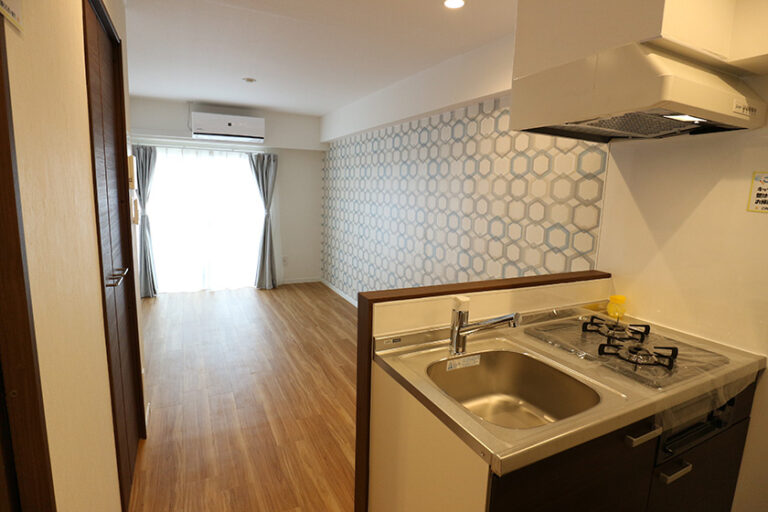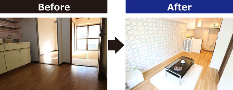 2Kとしてはコンパクトな約27㎡のお部屋。配置を変更し、1LDKに変更しました。水廻りの配置に苦戦しましたが、実用性のあるスタイリッシュな1LDKに変更し、賃料の大幅な向上につながりました。