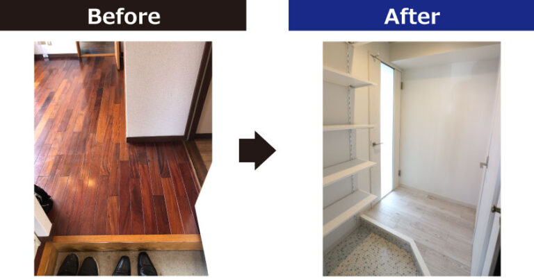 白を基調に明るいエントランス。見せる収納に変更しました。