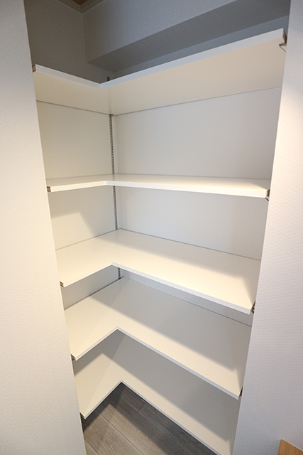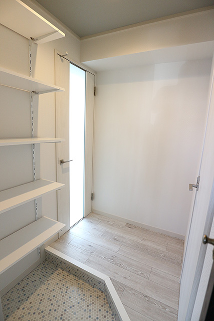 洗濯置場のスペースを可動棚に変更。収納スペースを増やしました。