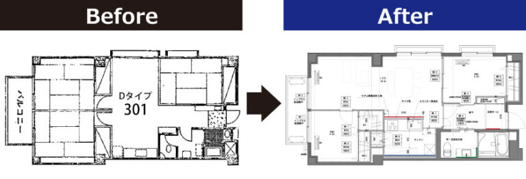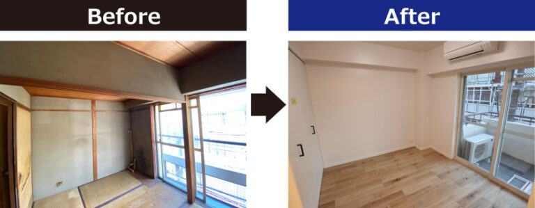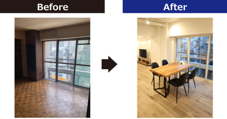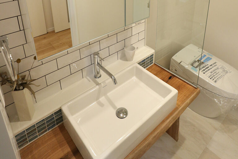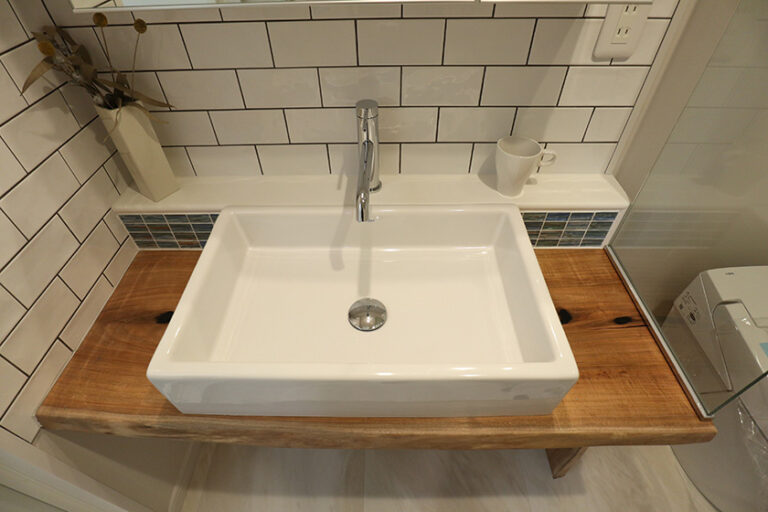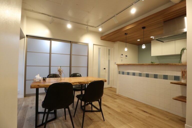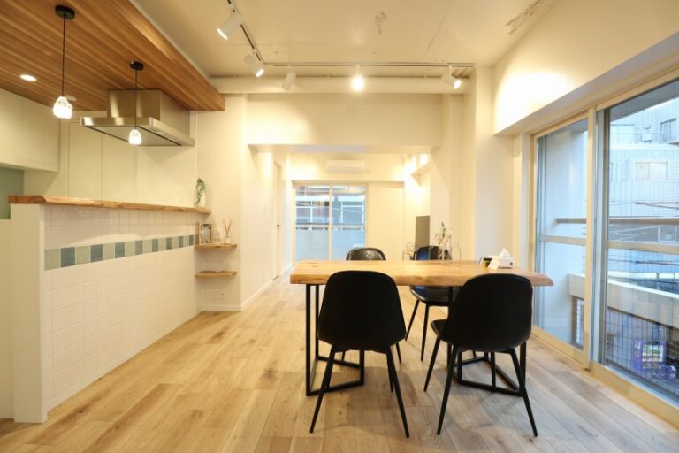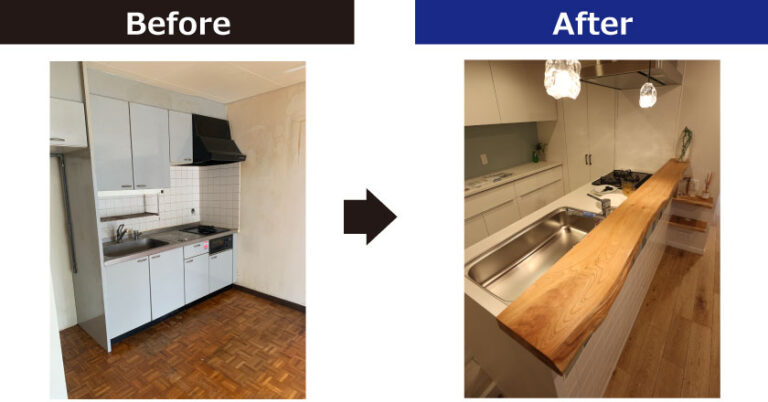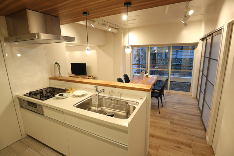 2021年フルリノベーション実施。「原木屋」の天然木の風合いを味わえる一枚板を「カウンター」と「洗面台」で使用しました。RCと建物としてのポテンシャルを最大限引き出すべく、2LDKからウォークインクローゼットを確保した1LDKへフルリニューアル。