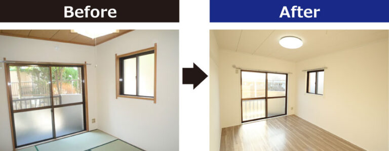 和室から洋室へリノベーションすることで、お部屋の雰囲気が大きく変わります、また洋室には「掃除が簡単でダニやカビの発生を抑えやすい」「畳や障子などがないため定期的なメンテナンスが必要ない」といったメリットがあります。