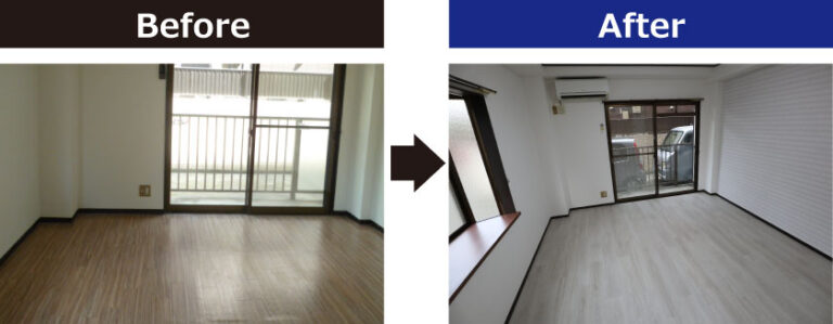 2年~4年で入退去が繰り返される賃貸住宅では退去後の原状回復工事を安価に済ませるのも重要な点です。フロアタイルなら色や柄の種類も豊富でデザイン性が高く、クッションフロアと違い跡が付きにくいためコストパフォーマンスの高いリフォームと言えます。