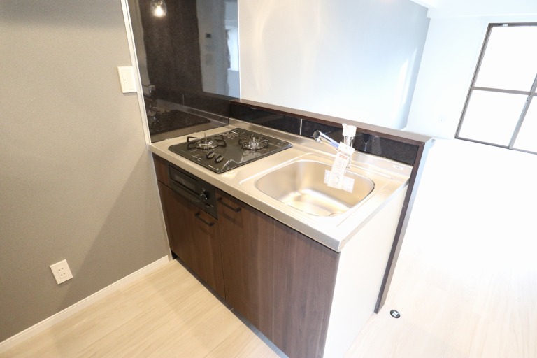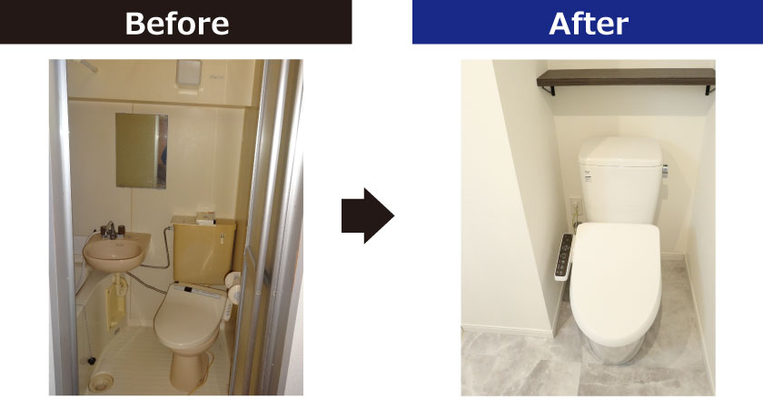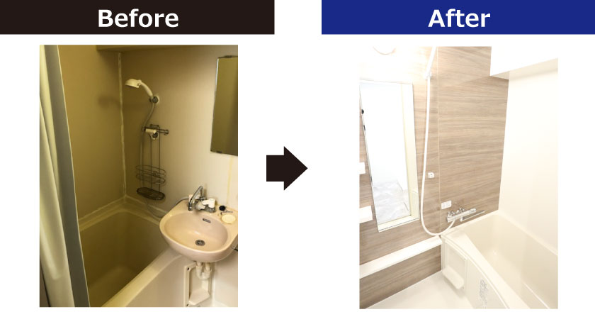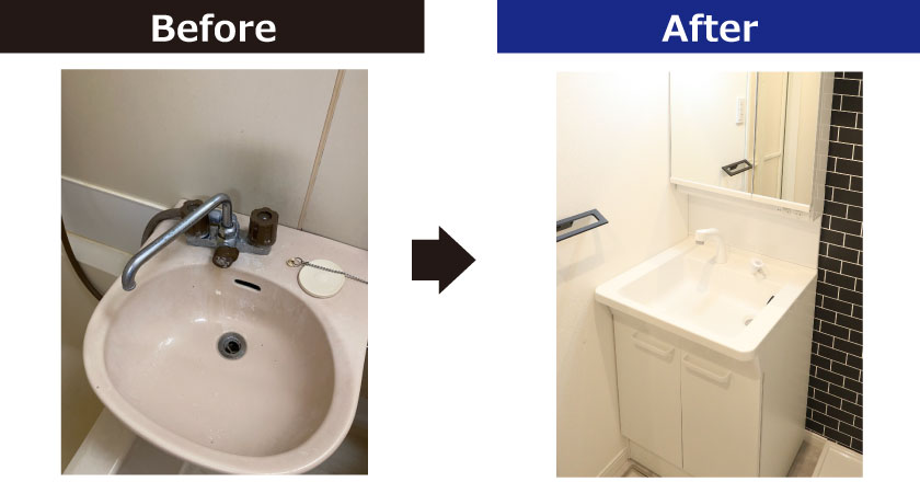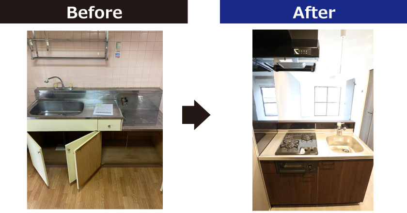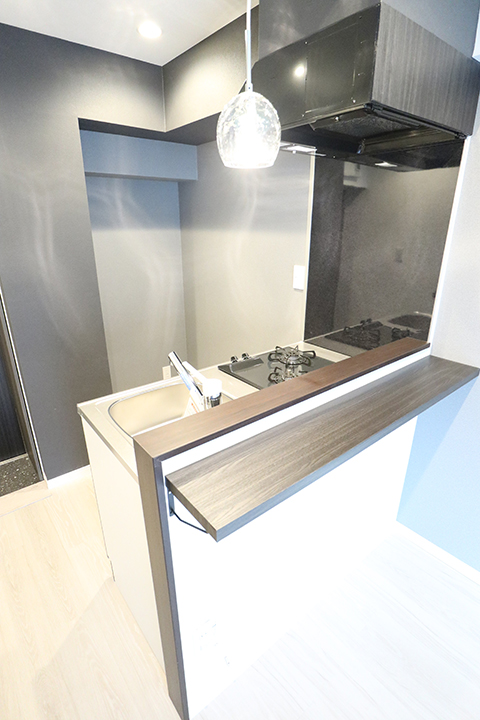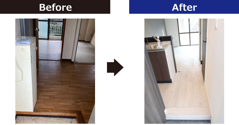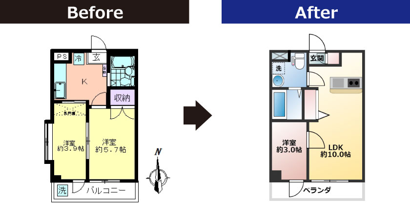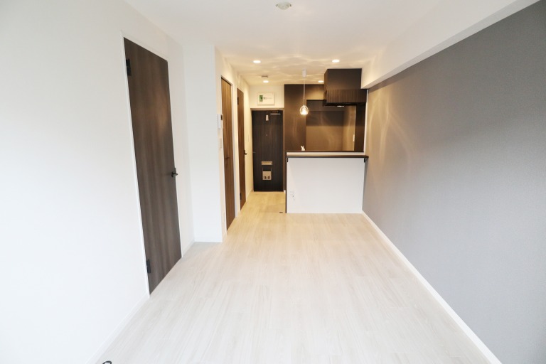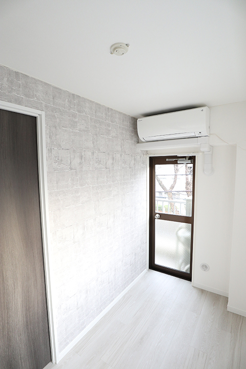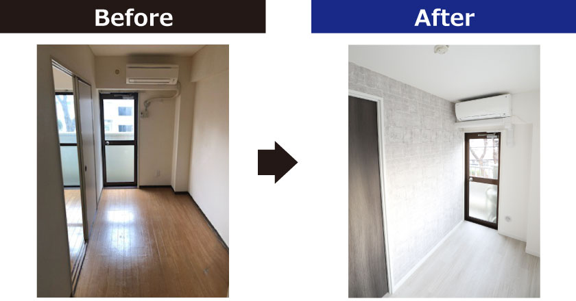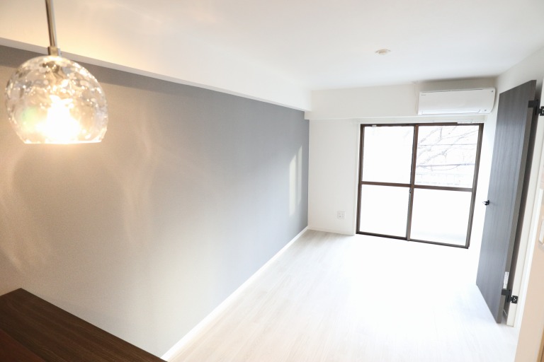 2Kとしてはコンパクトな約27㎡のお部屋。配置を変更し、1LDKに変更しました。水廻りの配置に苦戦しましたが、実用性のあるスタイリッシュな1LDKに変更し、賃料の大幅な向上につながりました。