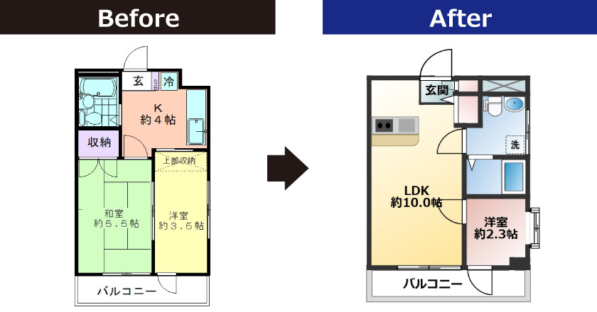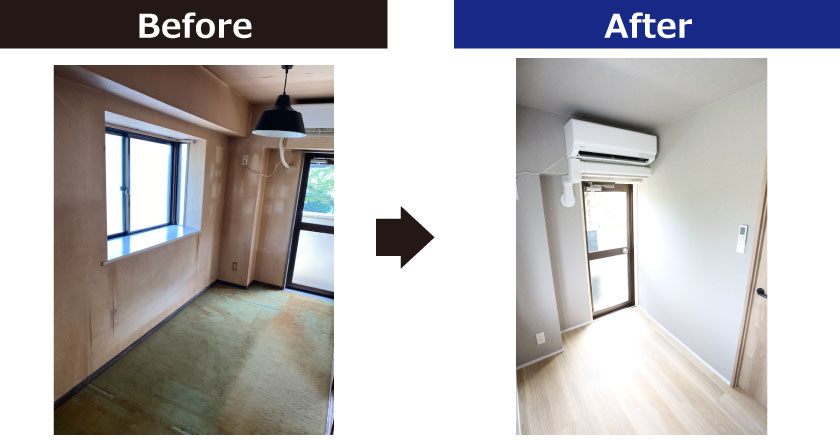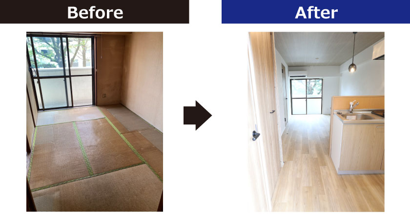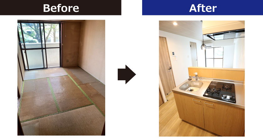 【全面リノベーション】1LDK「キャッスル萩山」(2) 2025.10.05全面リフォーム(アパート・マンション・戸建) キャッスル萩山 1LDK 専有面積(壁芯)26.46㎡ 築年月:1987年8月 リビング キッチン 寝室・居室 バスルーム トイレ・洗面化粧台 収納 担当者コメント 2Kとしてはコンパクトな約27㎡のお部屋。配置を変更し、1LDKに変更しました。水廻りの配置に苦戦しましたが、実用性のあるスタイリッシュな1LDKに変更し、賃料の大幅な向上につながりました。 施工事例 2022.08.21 【全面リノベーション】田無富士パーム … 2022.08.21 【全面リフォーム】寿町フラワーホーム … \ 相談無料・お気軽にお問い合わせくいださい / お問い合わせ・お見積り 全面リフォーム(アパート・マンション・戸建) 1LDK, フルリノベーション